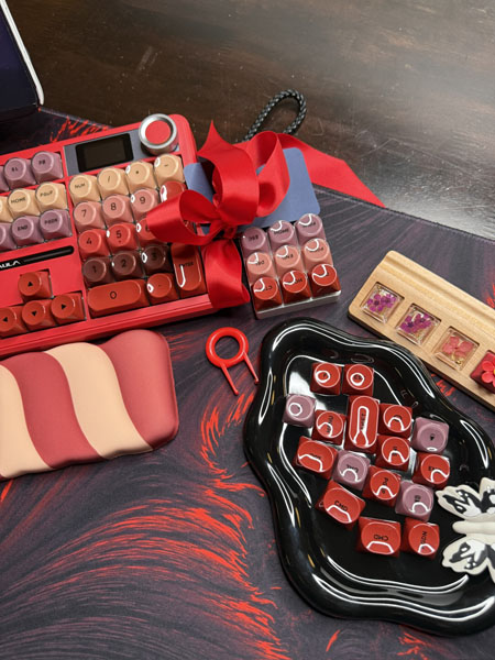 These can include the keyboard, special switches (if requested), artisan keycaps, artisan specialty keycap, wrist rest pad and deskmat.