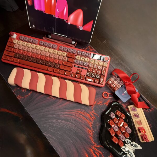 Red Lipstick Themed Full Kit Modified - Berry Edition Custom Mechanical Keyboard | ValindasKeys Artisan Desk Set - Wireless Keyboard Red Berry Edition, hand built and tuned by ValindasKeys. Each board is fully modified for premium feel, quiet performance - Blending deep violet tones with soft red legends on a nice red base keyboard. Gasket mounted for super smooth typing and upgraded Linear switches (creamy not too loud - silent switches are always available) RGB backlighting with animated effects. Knob and side lighting control for volume and board controls. Artisan lipstick keycaps Includes: Keyboard, USB cable for wired mode, extra keycaps, Custom made Fidget, and Red/Blk Desk Mat. (Full 100% complete board with numpad) -