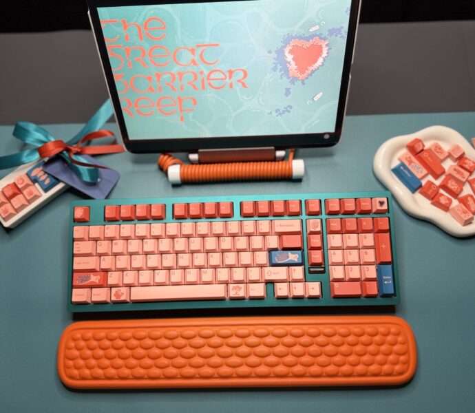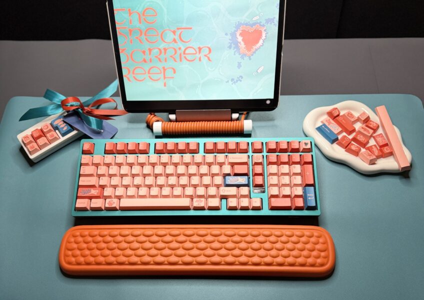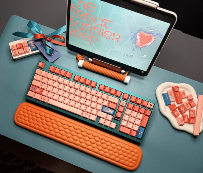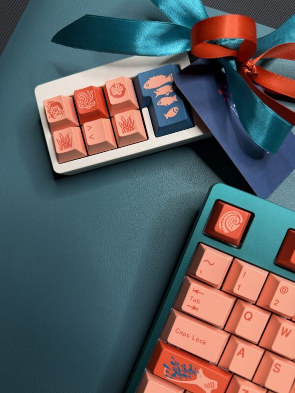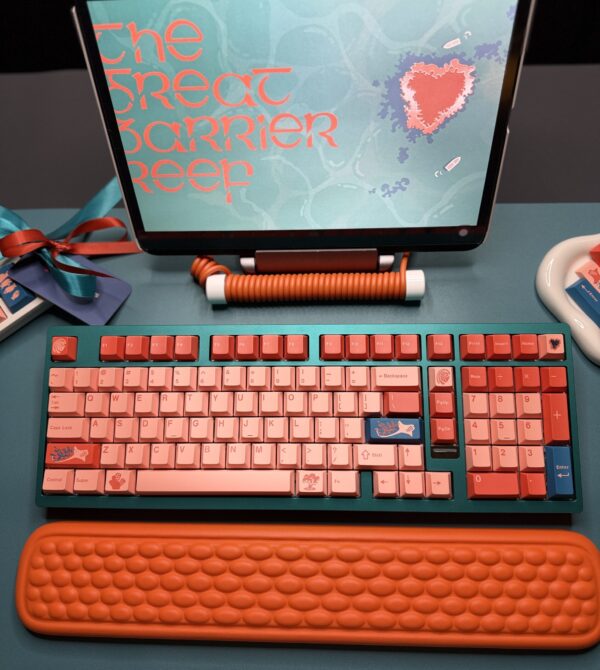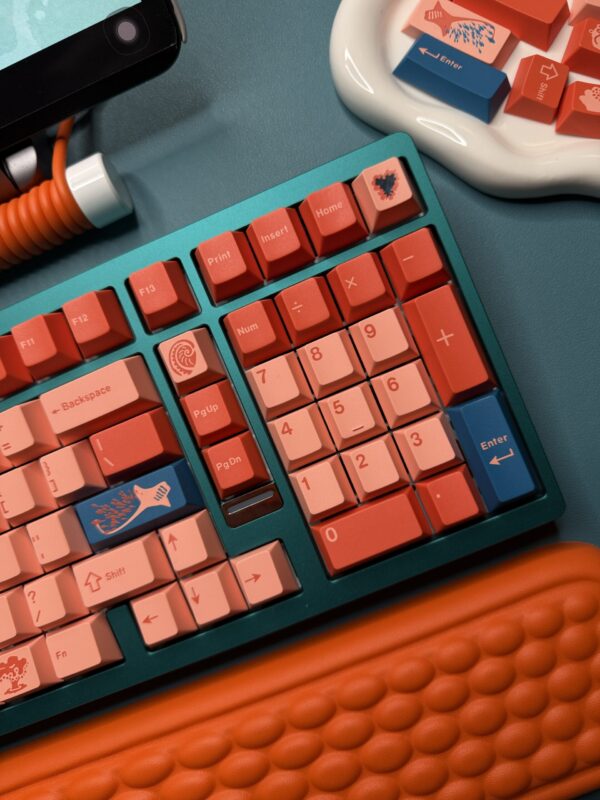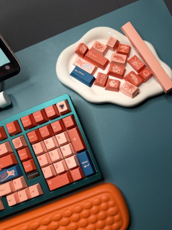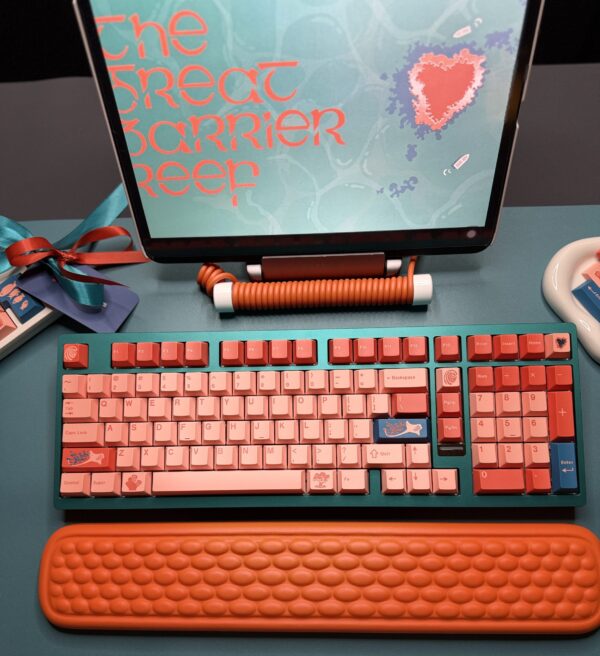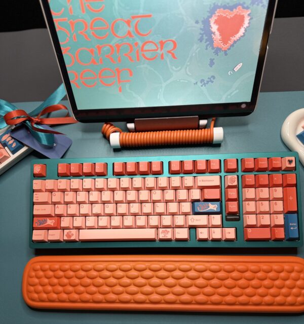 Barrier Reef Mechanical Keyboard Full Set: 100% Beautiful Teal Wireless Keyboard Aluminum, CapyBara(TM) Linear Switches Smooth, Artisan Barrier Reef Keycaps, Matching Theme Desk Mat, Fidget and Wrist Pad. Set includes: Beautiful high end Teal Aluminum keyboard 102 keys with numpad, CapyBara(TM) smooth switches, Artisan keycaps with matching waterproof desk mat, fidget and orange hue Wrist Rest Pad. Super nice upgrade for any office, WFH, gaming. Step up!