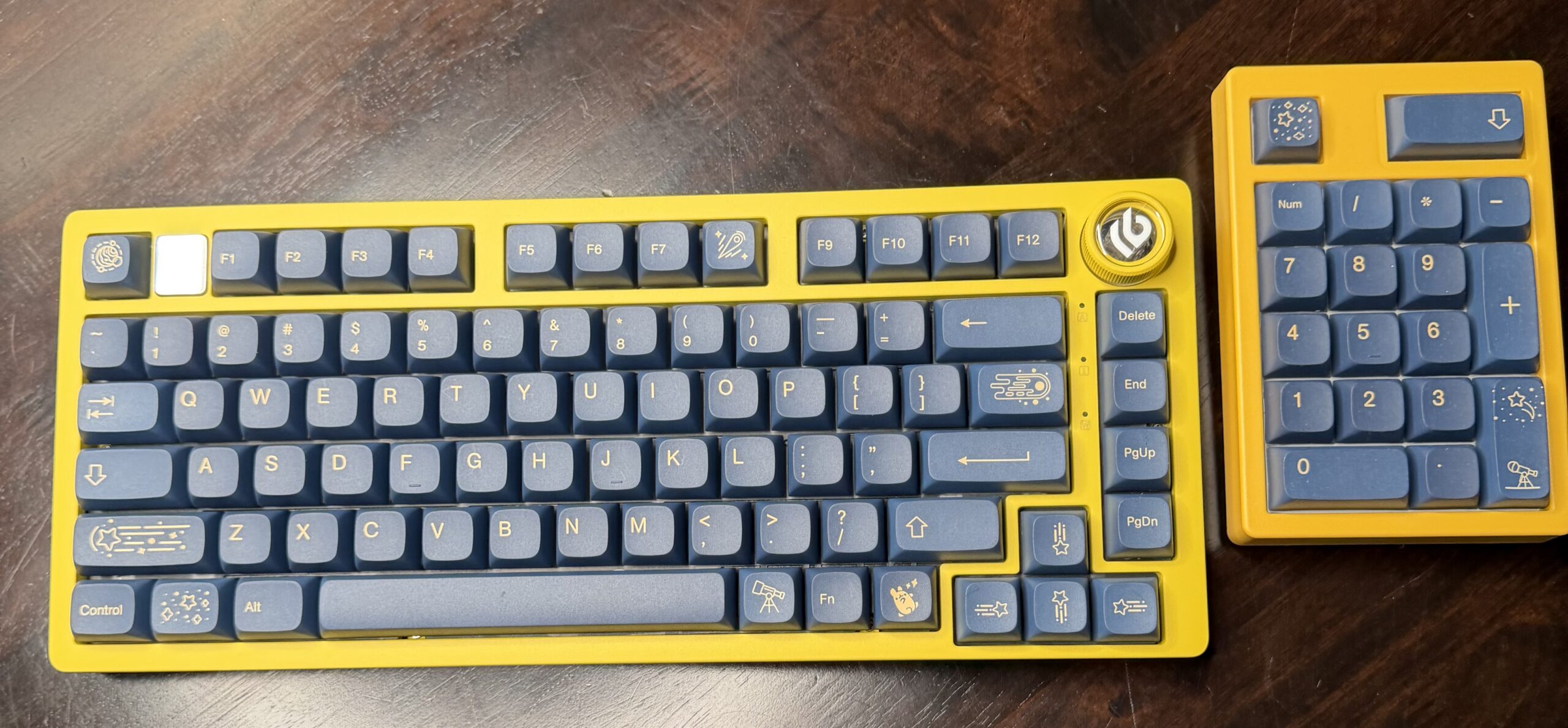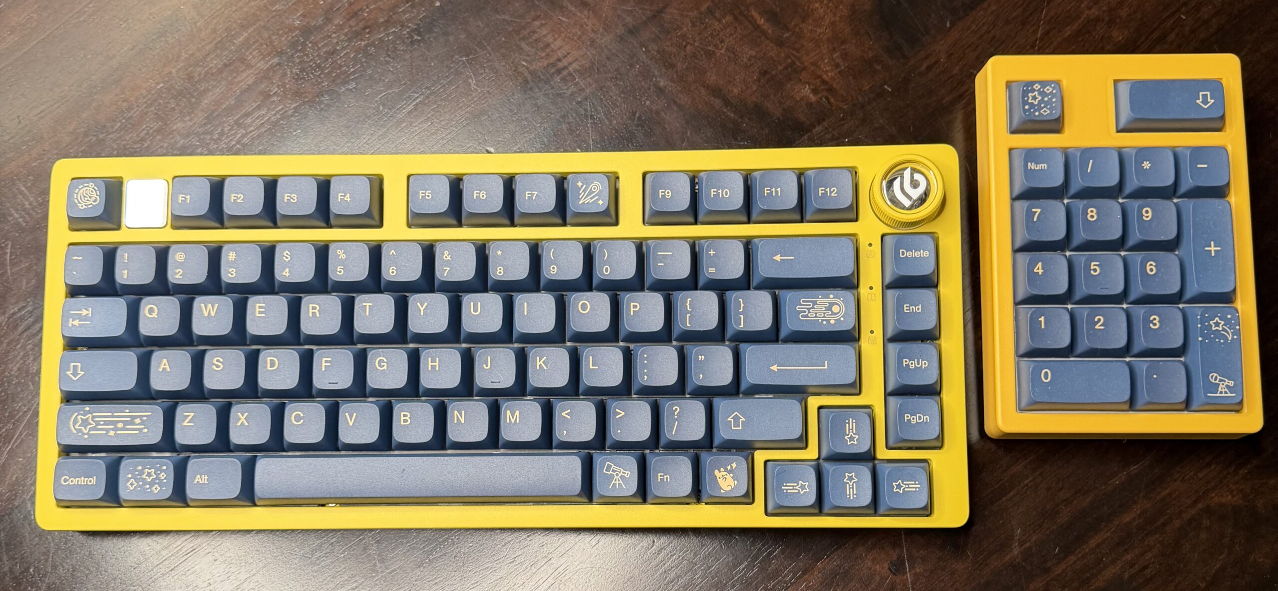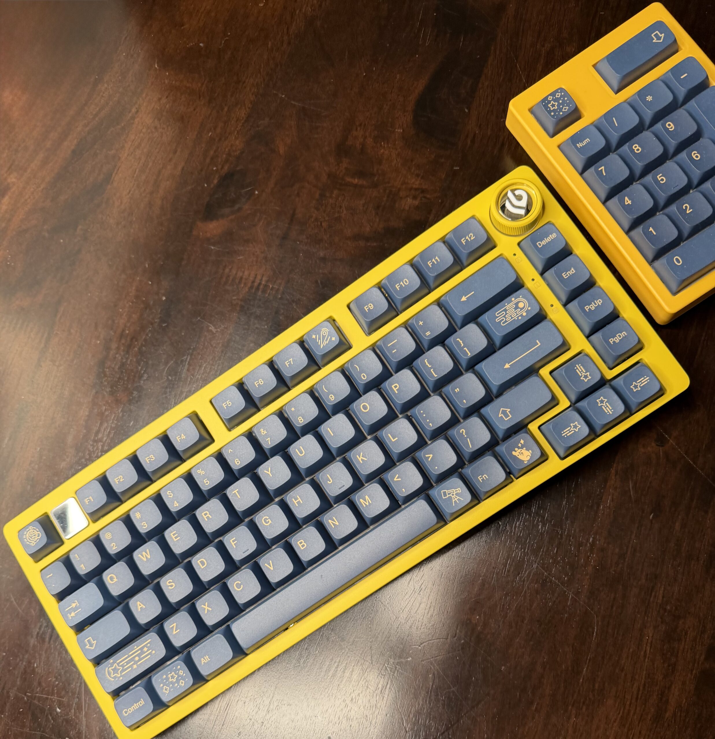 75% layout but you have the numpad for convenience.  Really a talking piece, unusual to see CNC yellow on a keyboard and this Hi75 is a great quality brand. Kit designed by @ValindasKeys
