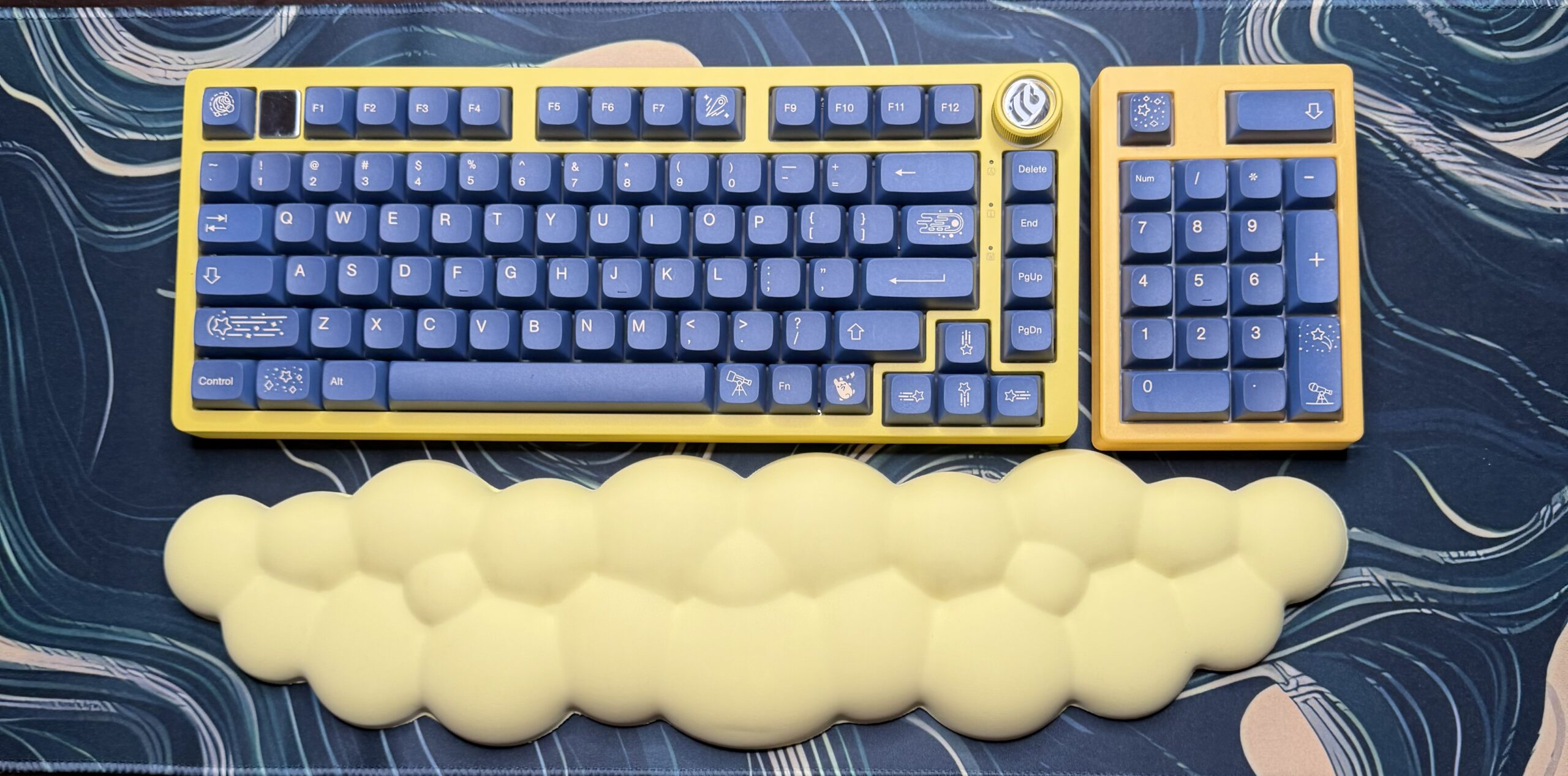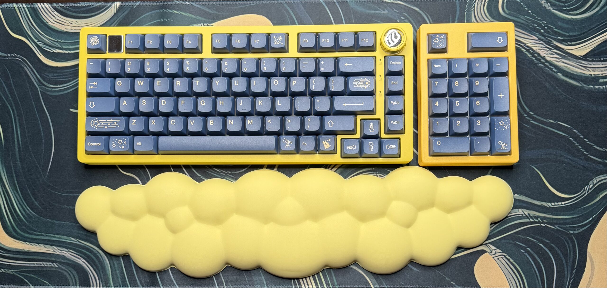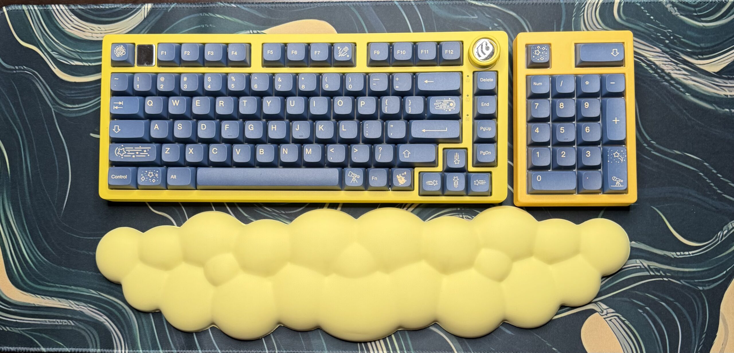 75% layout but you have the numpad for convenience.  Really a talking piece, unusual to see CNC yellow on a keyboard and this Hi75 is a great quality brand. Kit designed by @ValindasKeys