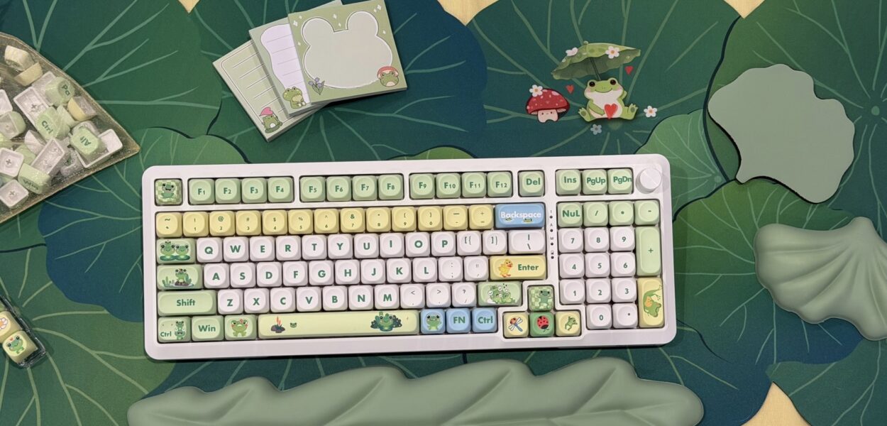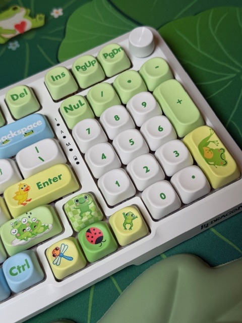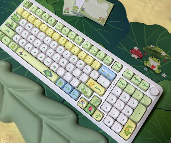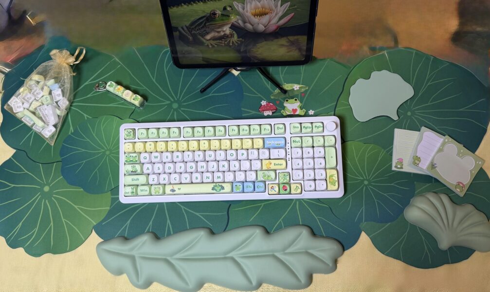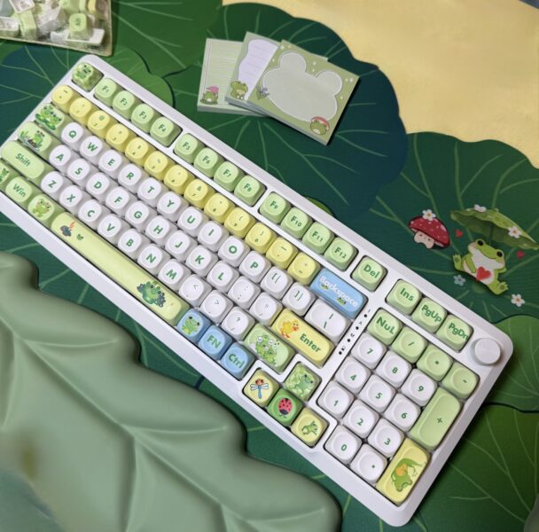 Frog on a Lily Pad Theme Mechanical Keyboard Full Set: 96% Mechanical Keyboard, RGB Lights, Creamy Switches, Matching Lily Pad Desk Mat, with Wrist Rest Pad, Coaster, Post-its and Fidget. Set Includes: 96 Key Mechanical Keyboard with full RGB Backlights, Creamy typing experience. Frog Lily Pad Theme artisan Keycaps, matching Lily Pad Desk Mat also, Wrist Rest Pad in a leaf pattern and a set of matching Post-its, fidget and coaster for a fun office or WFH or gaming upgrade!