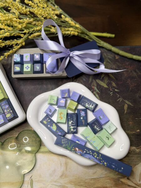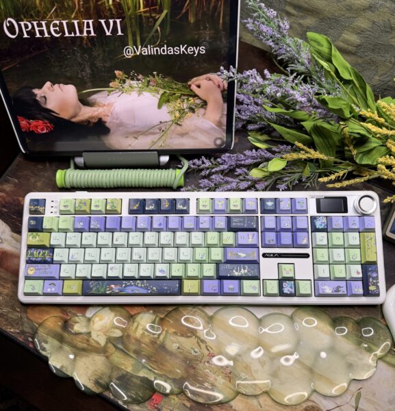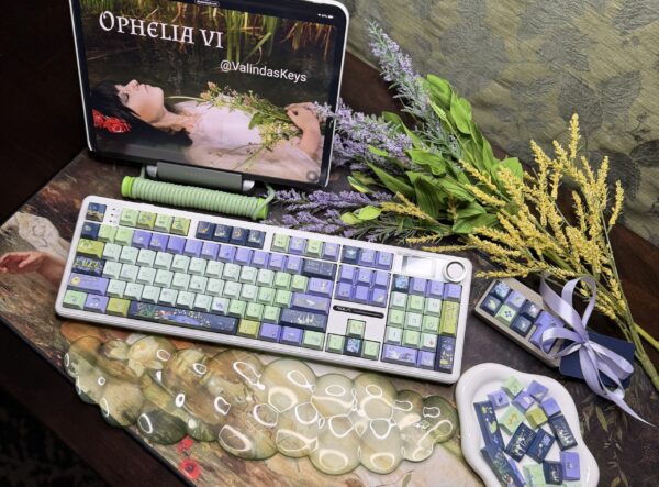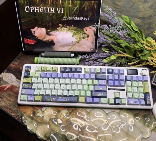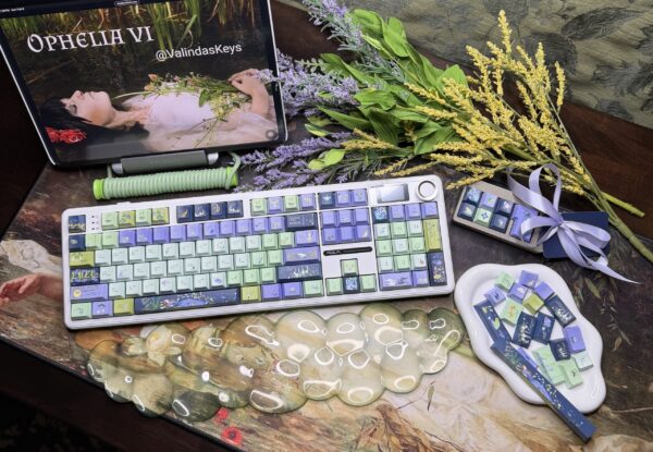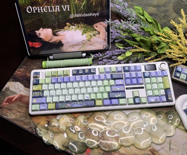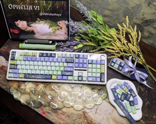 Set Includes: Mechanical Keyboard 100%, all accessories and cables, matching desk mat in Ophelia Theme, matching Fidget in Ophelia Theme artisan keycaps, extra artisan keycaps, Green “water” feel Wrist Rest Pad, Green matching Coil Cable and Bar for Cable.
