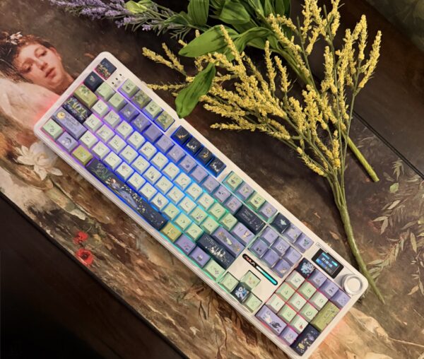 The beautiful Ophelia VI Themed Mechanical Keyboard Full Set includes a top of the line quality 100% mechanical keyboard with complete RGB bright lights with all options, Wireless Trimode connectivity and dongle. Dongle is stored on back of keyboard.