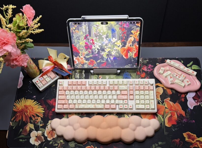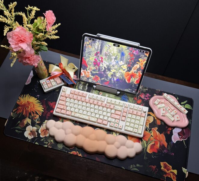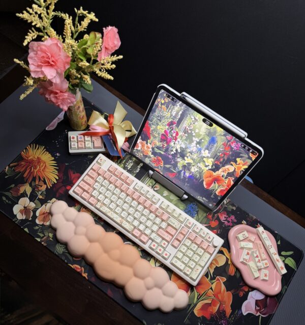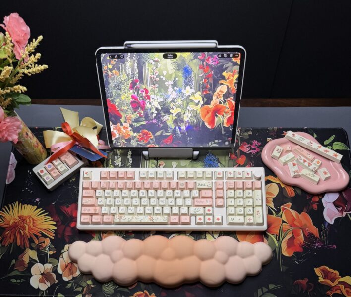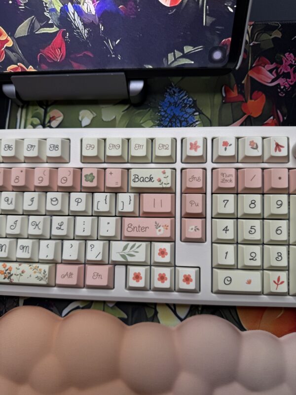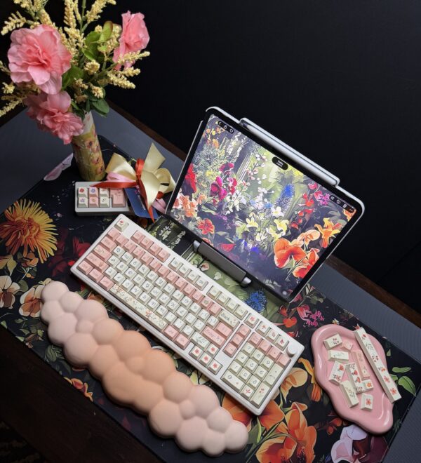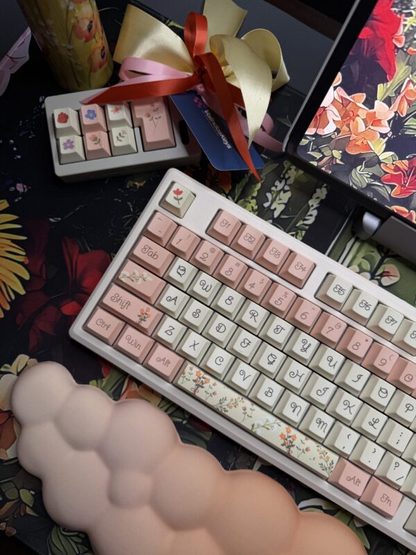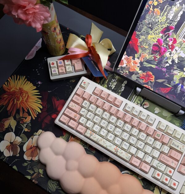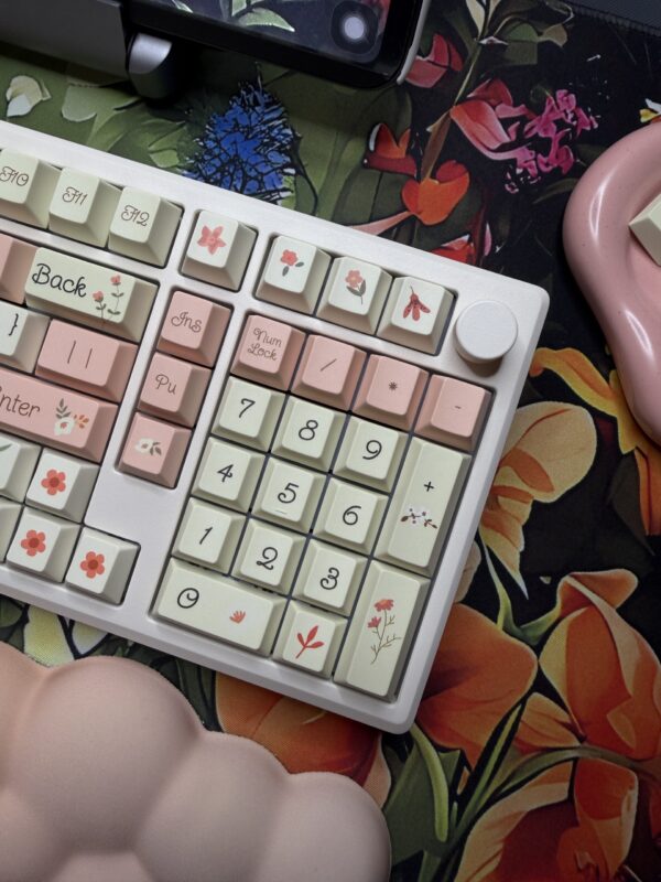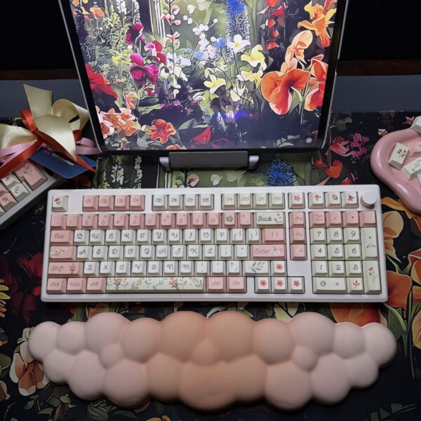 Spring Flowers Theme Mechanical Keyboard Full Set: 100% Mechanical Keyboard, RGB Lights, Cream Aluminum Base High Quality Keyboard, Wisteria Switches, Matching Flower Keycaps Fidget and Wrist Pad